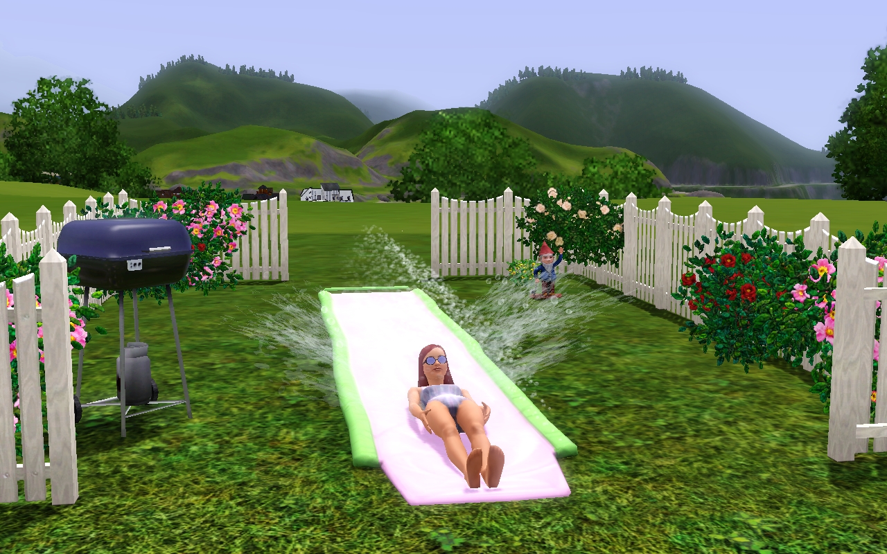 Behind them stood a picket fence, a water slide, with other decorations, you would usually find in a family garden in the summer.